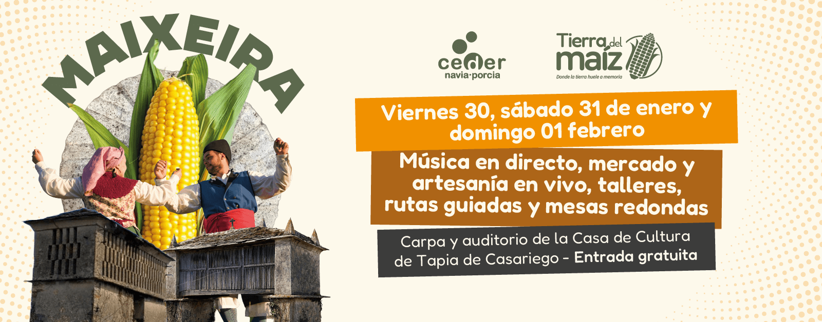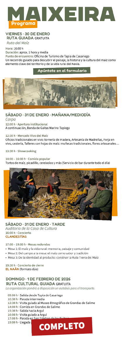 Este 30 y 31 de enero y 1 de febrero celebramos en Tapia de Casariego la primera edición de MAIXEIRA, un festival que nace para poner en valor lo mejor de lo local: cultura viva, artesanía, talleres, gastronomía y música, conectando raíces y creatividad en el Valle del Navia.
